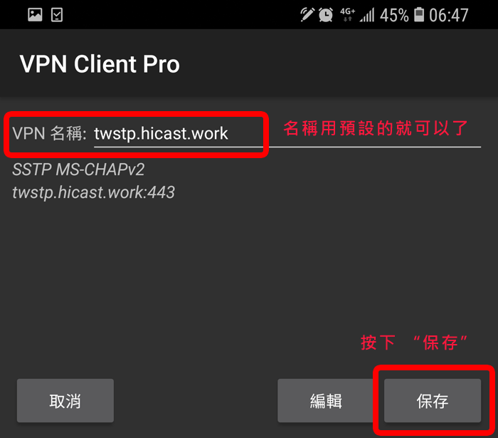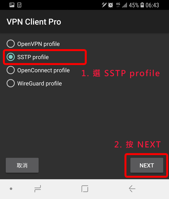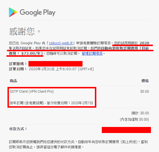請你先到 Google Play 搜尋 "VPN Client Pro" 這個 App (這是第三方的 App,並不是我們開發的),然後安裝它,這個 App 有提供七天免費試用期,你可以先試用看看;當你選擇 SSTP 時,它會叫你先訂閱,你一定要訂閱才能使用喔,訂閱後它會給你七天的免費試用期,如果到時候你不想付費,請記得在到期前務必取消訂閱 !