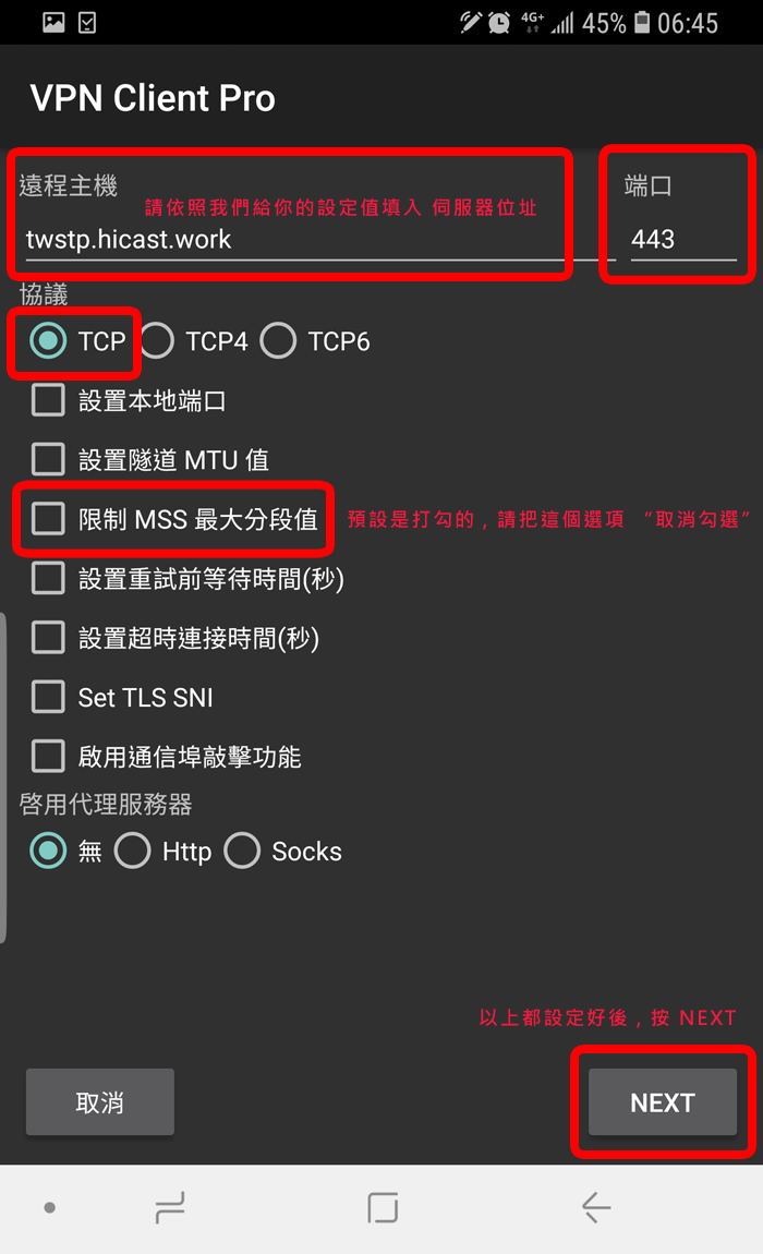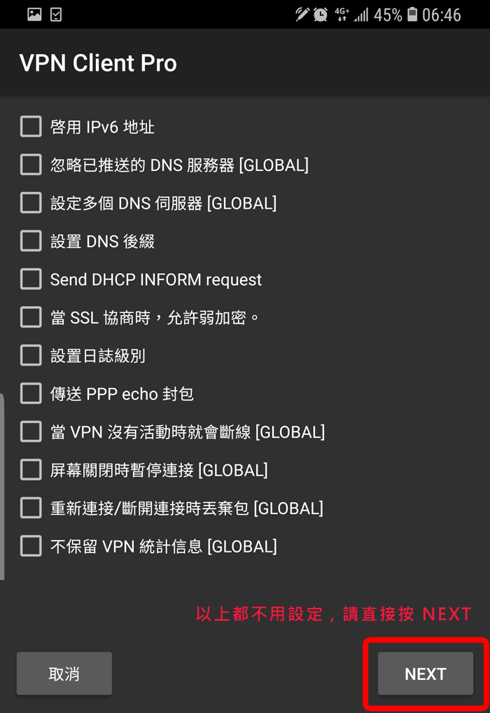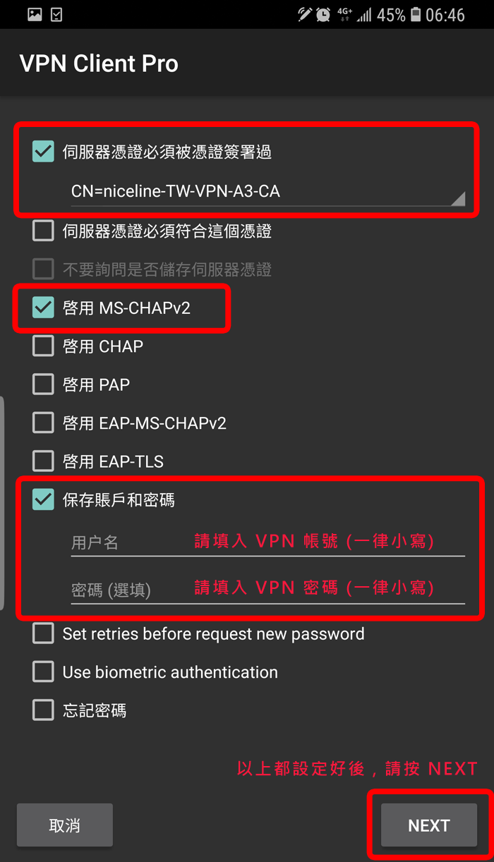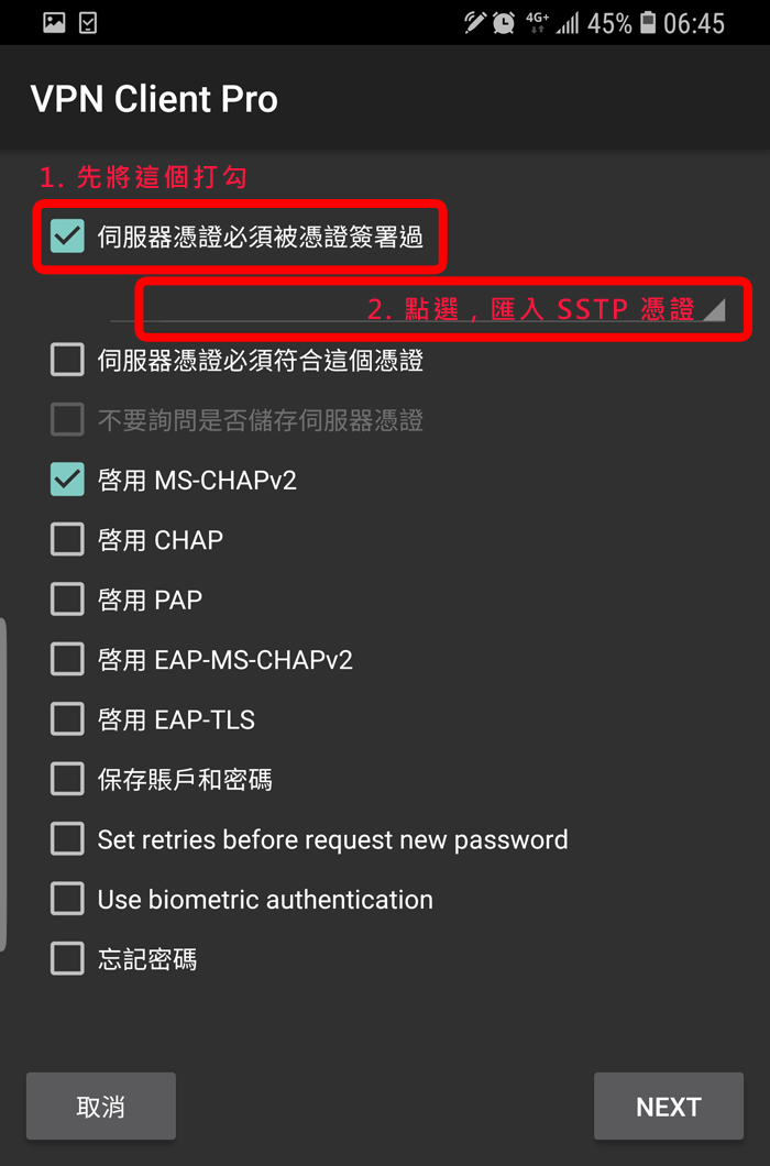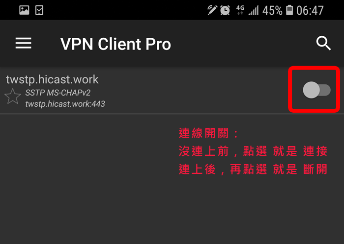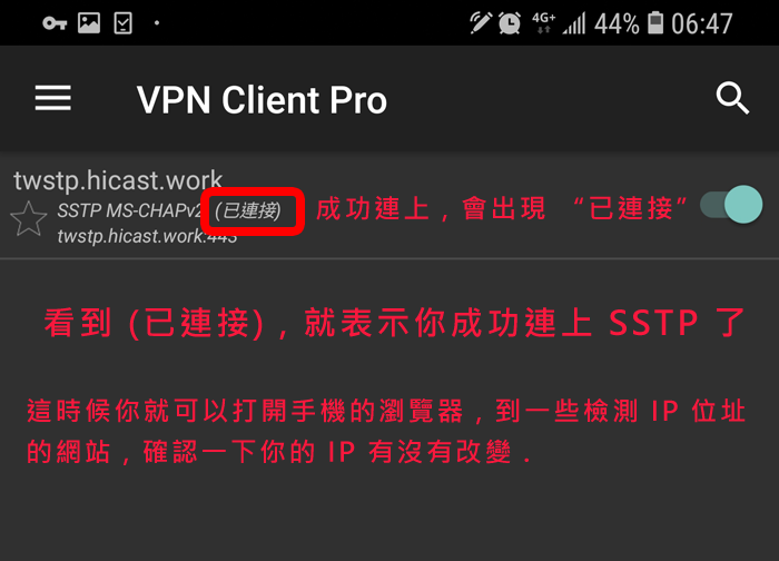 請你先到 Google Play 搜尋 "VPN Client Pro" 这个 App (这是第三方的App,并不是我们开发的),然后安装它,这个 App 有提供七天免费试用期,你可以先试用看看;当你选择 SSTP 时,它会叫你先订阅,你一定要订阅才能使用喔,订阅后它会给你七天的免费试用期,如果到时候你不想付费,请记得在到期前务必取消订阅!